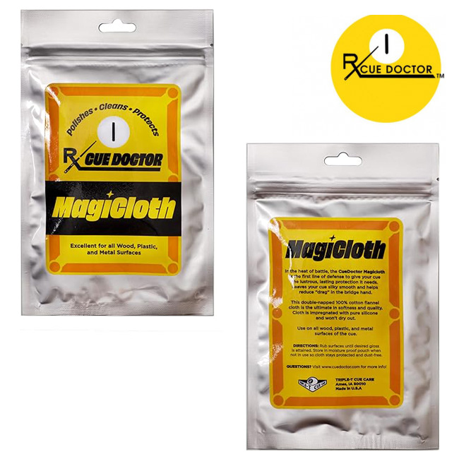Салфетка для чистки кия Cue Doctor MagiCloth удовлетворит нужды требовательных игроков, обеспечив быструю очистку кия и предохраняя шафт от загрязнений. Она изготовлена из хлопка с двойным ворсом, бережно и тщательно очищающим поверхность, и дополнительно пропитана силиконом. Благодаря последнему обстоятельству она не впитывает запахи, практически не изнашивается и не пересыхает при долгом хранении.