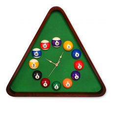 Часы могут быть как треугольной формы, так и круглой, расцветка выполнена по всем традициям цветовых оттенков, используемых в современном бильярде, а циферблаты выполнены в виде различных бильярдных шаров. Такие часы украсят помещение любой бильярдной.