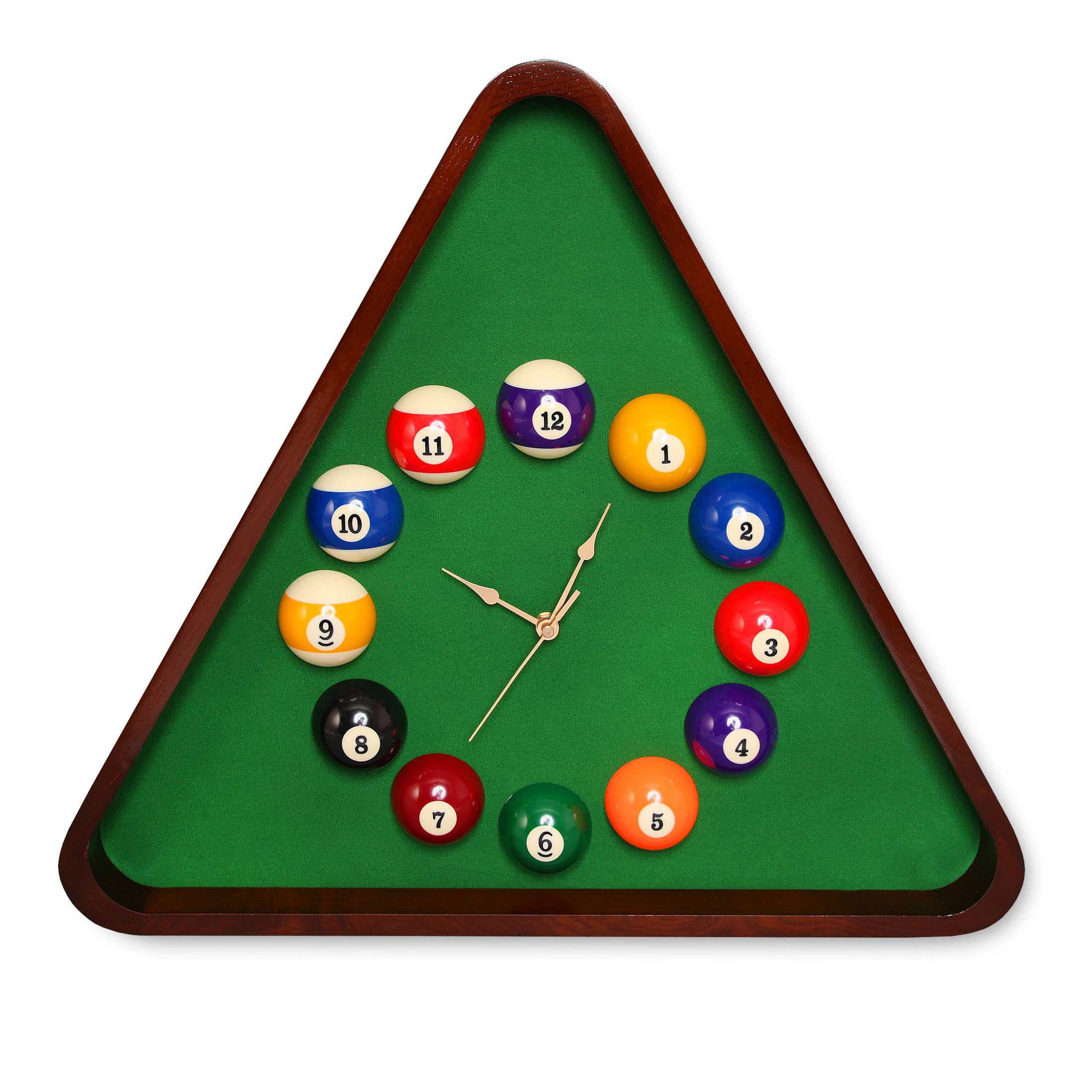 Настенные часы для бильяра изготовлены в виде бильярдного треугольника: с цифрами на бильярдных шарах и с фоном зеленого цвета. Часы бильярдные треугольник оснащены электронным механизмом и крупными стрелками, в том числе, секундной. Заводить часы не требуется, поскольку устройство работает от батареек (в комплекте не поставляются).