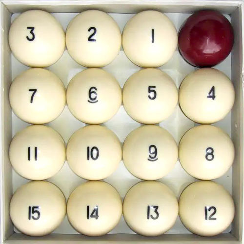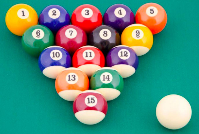 В пуле (американский бильярд) 16 шаров. Полный комплект шаров для пула состоит из одного битка белого цвета и пятнадцати пронумерованных цветных шаров особых цветов.
