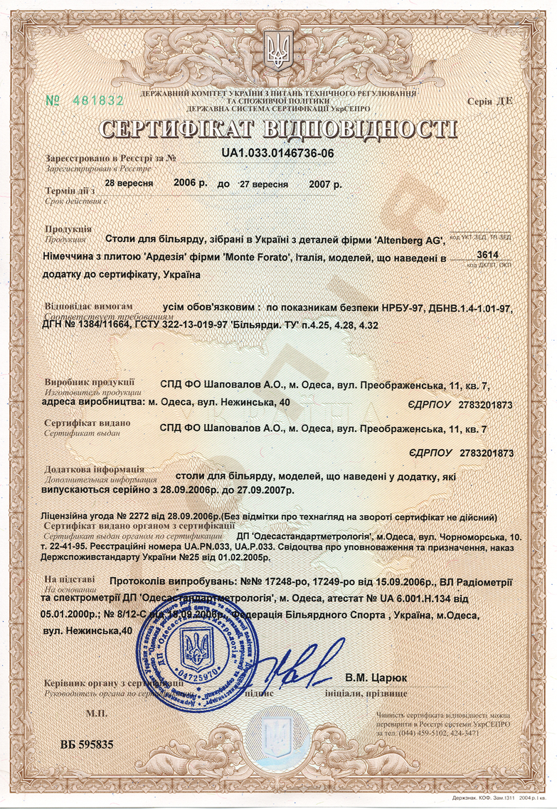 Сертификат качества | «БИЛЬЯРД СЕРВИС»
