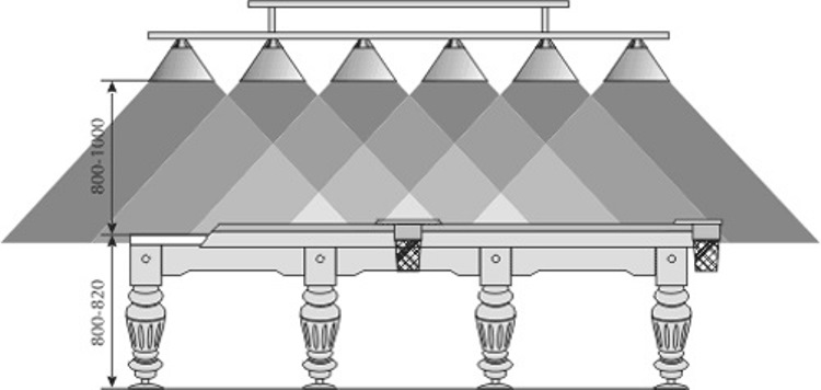 - Светильники повешены чересчур высоко или низко (в первом случае свет будет попадать в глаза и отвлекать, во втором игроки будут постоянно задевать светильники киями.